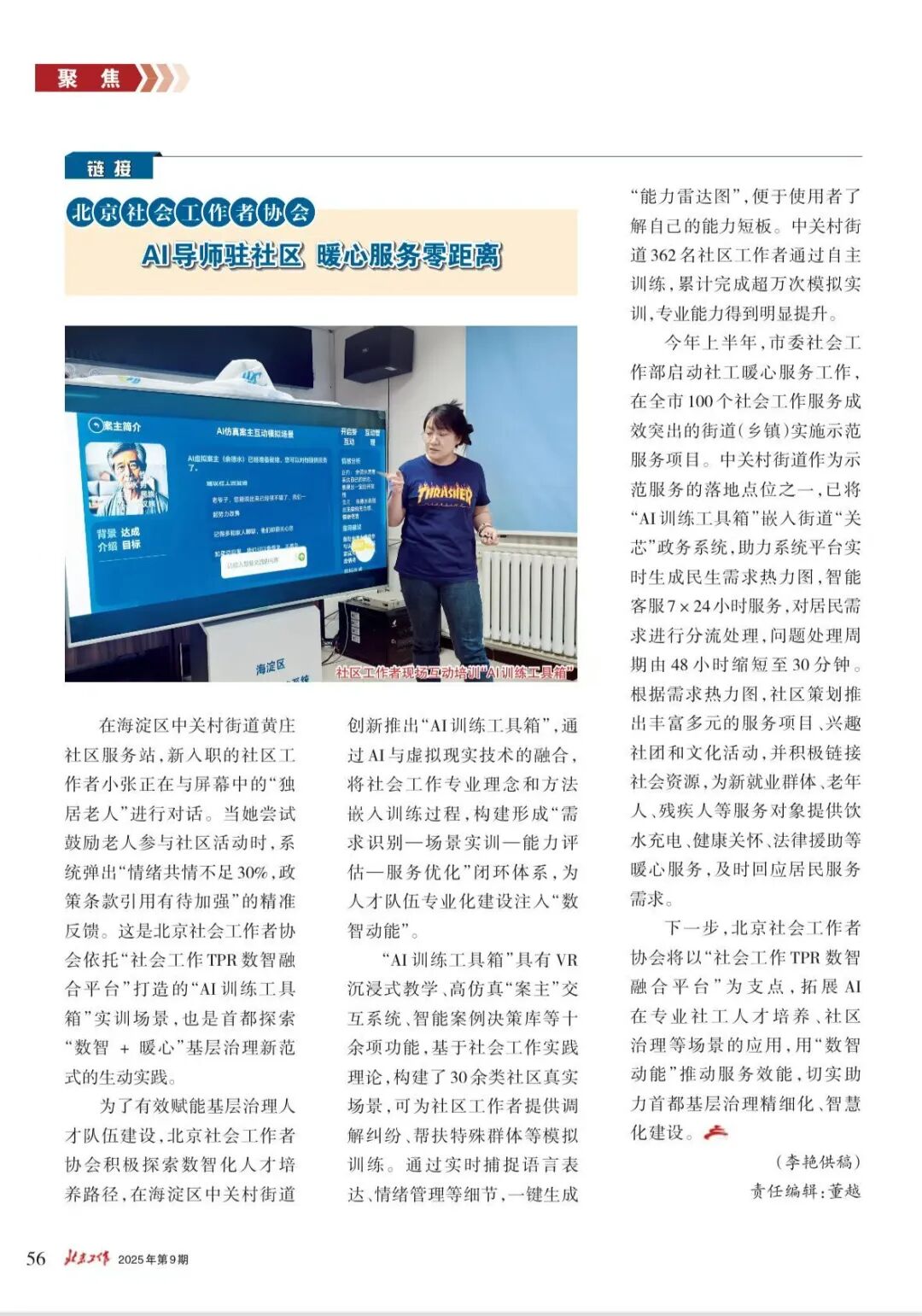 回首过往六年,美亚联创与北社协始终秉持产教融合理念,坚定不移地深耕社会工作继续教育赛道。凭借不懈的努力与卓越的创新能力,双方成功为北京 6 万余名持证社工赋予了强大的科技力量,助力他们在专业领域不断成长与进步。双方联合精心打造的社会工作TPR数智融合平台,凭借其专业的深度与创新的价值,成功入选北京工作党内刊物。这不仅是对双方过往合作成效的高度肯定,更是对我们坚守初心、服务社工行业的巨大鼓舞。