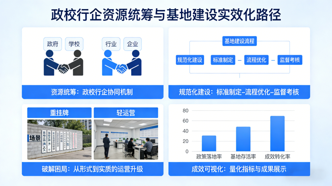 如何统筹政校行企社资源,推动基地建设规范化、实效化,破解“重挂牌、轻运营”困局,确保政策落地有声、成效可见?