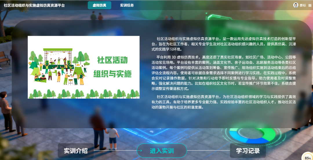 平台依托三维建模技术打造高保真虚拟实训场景,精准还原社区服务中心、社区矫正场所、困境群体家庭等10+高频社工场景,涵盖困难帮扶、心理慰藉、矛盾调处、社区治理、乡村治理、信访工作、新就业群体服务、职工帮扶、青少年事务、教育辅导、基层文化活动组织、禁毒戒毒、社会救助、老龄和养老服务、儿童关爱、社区矫正等典型任务。学生通过社会工作数字沙盘、VR虚拟仿真设备等均可实现“身临其境”演练,在零风险环境中反复打磨服务流程,彻底解决真实场景稀缺、实训安全隐患等痛点。从校内人才培养角度,例如中国社会科学院大学、中国劳动关系学院、民政职业大学、山东大学、重庆城市管理职业学院、贵阳幼儿师范高等专科学校、武汉民政职业学院、湖南女子学院、保山学院、乐山师范学院、浙江省委党校等多所院校,依托TPR数智融合平台建成多功能实训实验功能区,让社工专业群千余名学生实现随时随地沉浸式实训,大幅提升实务操作能力。